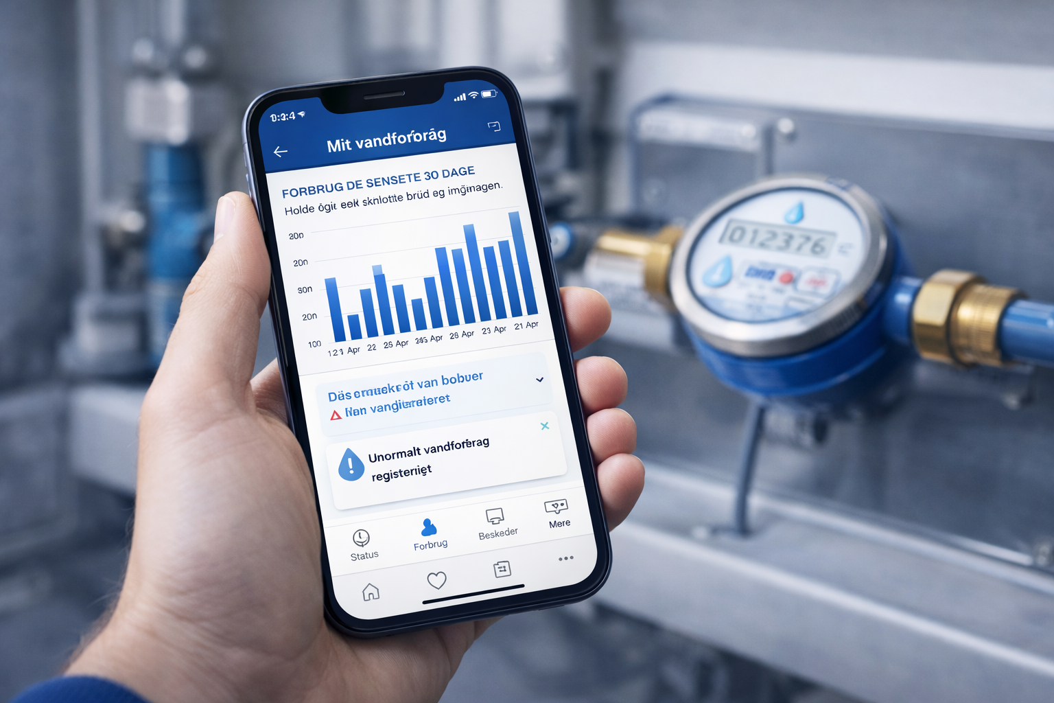 Med appen får du et bedre overblik over dit forbrug og kan følge udviklingen løbende. Det gør det lettere at opdage ændringer – for eksempel hvis der opstår et skjult brud eller en installation, der bruger mere vand end forventet.